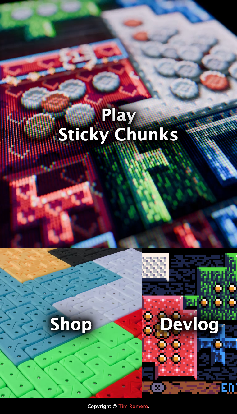 In my notes app as of this writing I have about a thousand words of scattered thoughts and ideas about Sticky Chunks features, game variants and plans. In the "game variants" umbrella I have over 40 varied small and large changes to the format of Sticky Chunks. Some of these are minor rule changes, some describe completely different games. In fact, one of those completely different game concepts is the idea that inspired Sticky Chunks! I didn't even make the first idea I had.